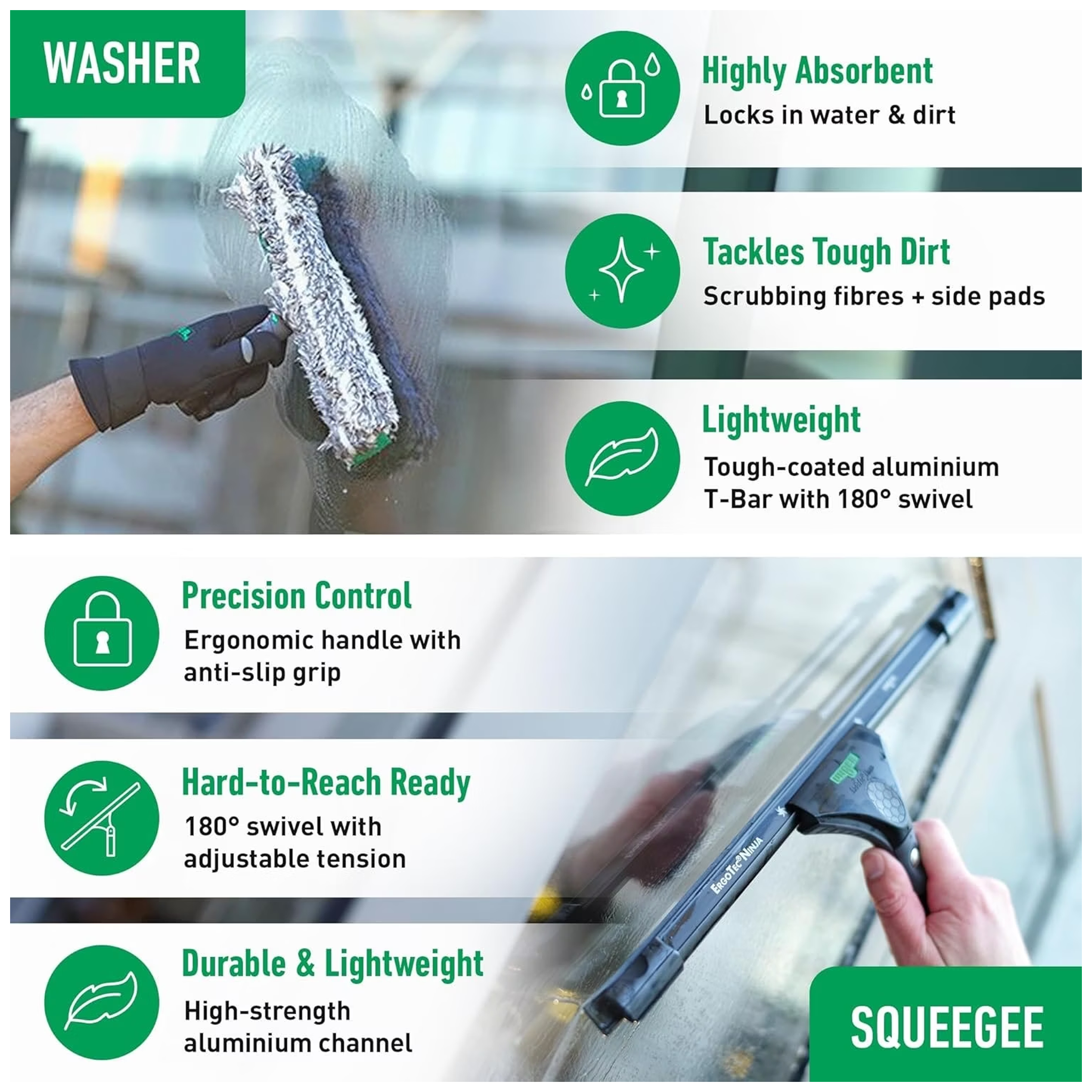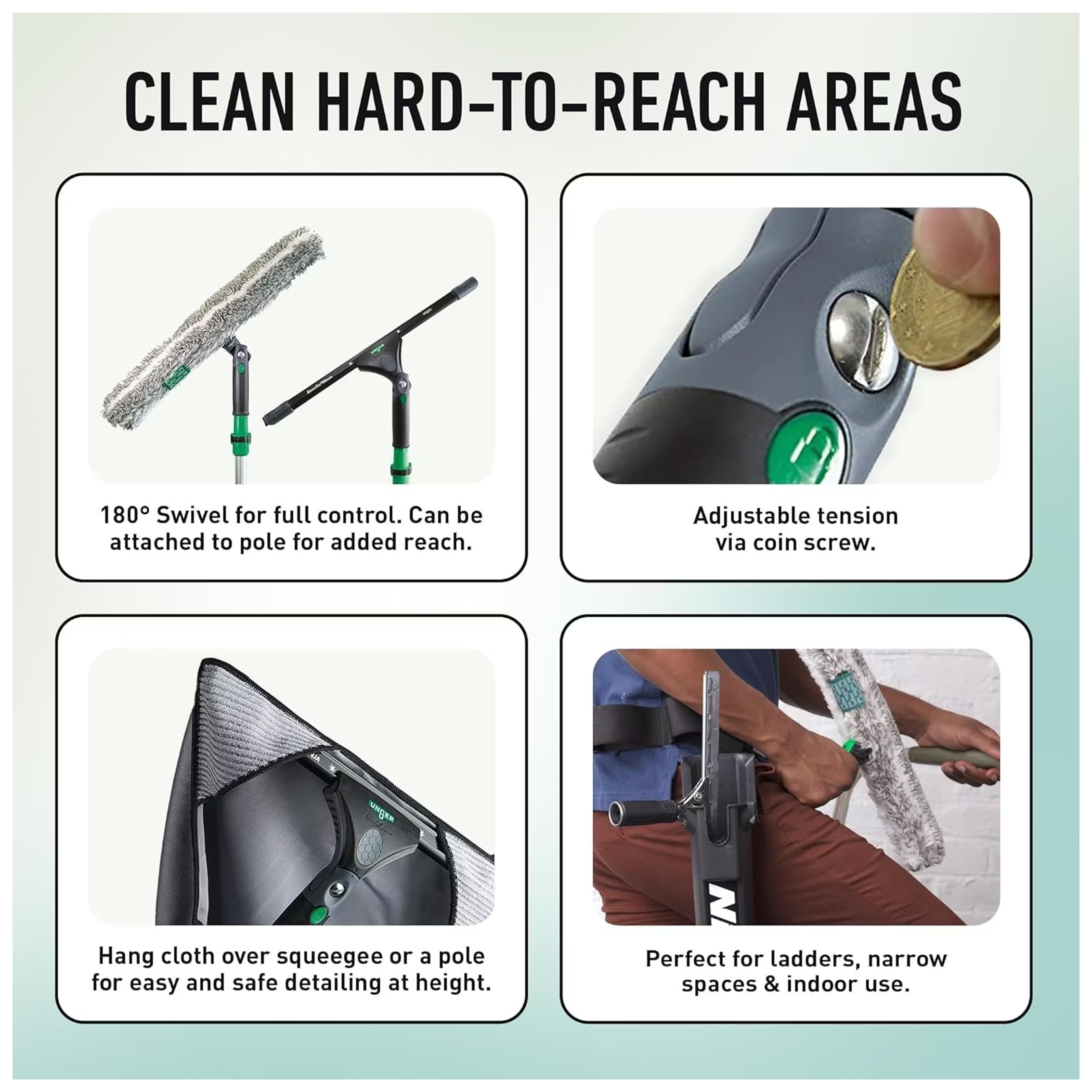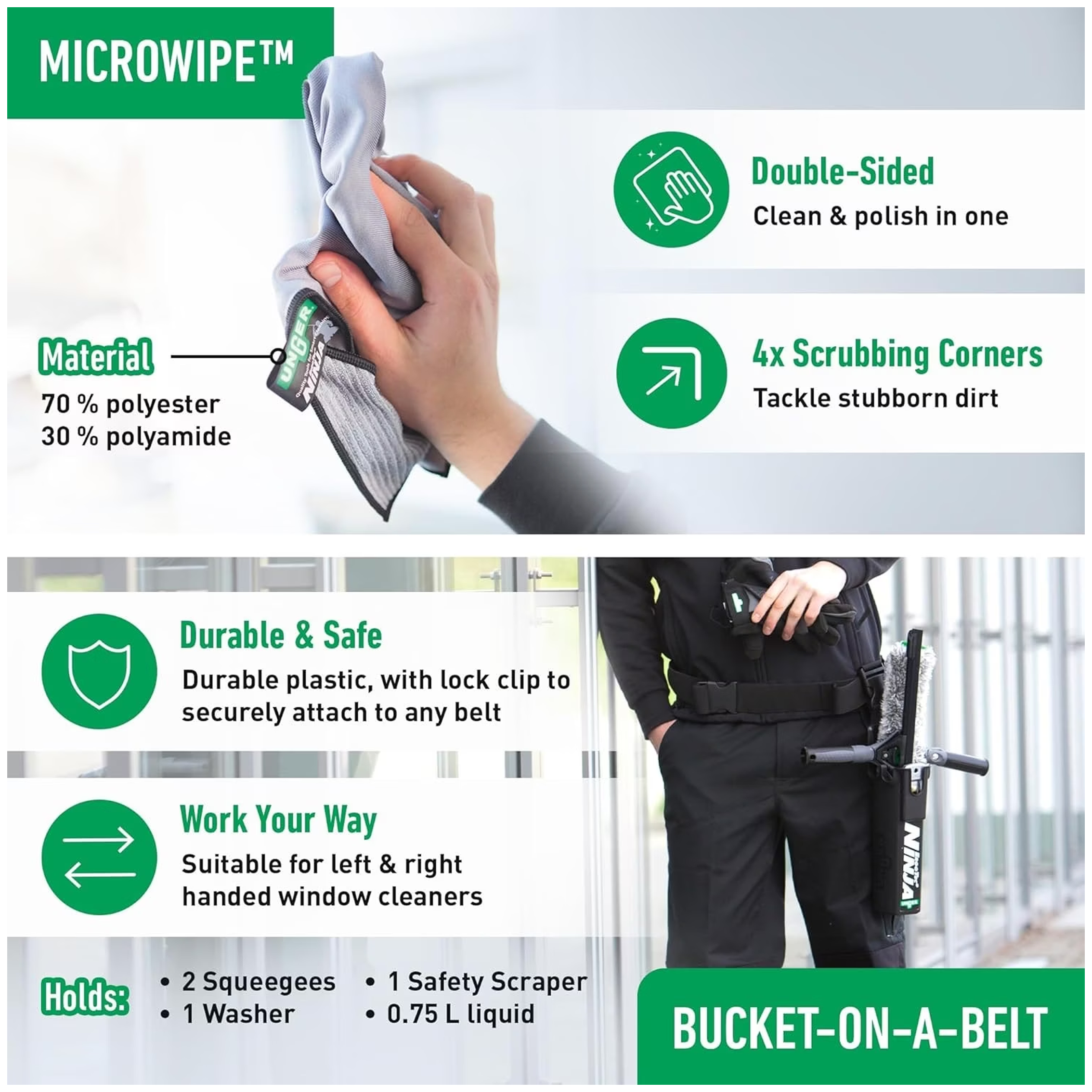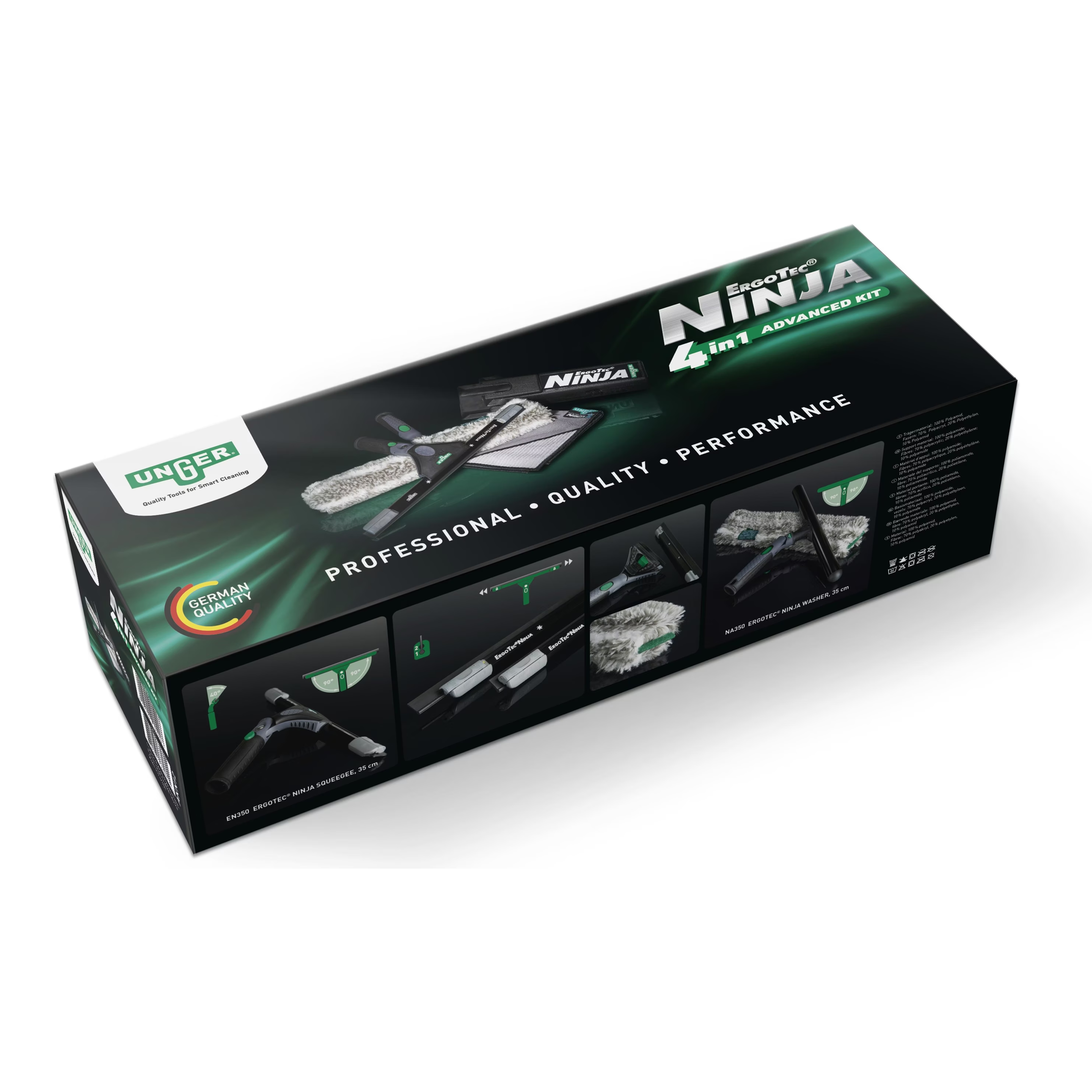- Le kit avancé ErgoTec NINJA 4in1 Unger constitue une solution idéale pour les professionnels du nettoyage. Ce kit comprend des outils de haute qualité, tels que la raclette de vitres ErgoTec Ninja de 35 cm, qui garantit une finition impeccable. Accompagnée du mouilleur ErgoTec Ninja de 35 cm, cette combinaison permet d’assurer un nettoyage efficace et rapide des surfaces vitrées. De plus, l’ErgoTec Ninja Microwipe de 40 x 40 cm est parfait pour parfaire le nettoyage en éliminant les traces et les résidus. Avec le seau ErgoTec Ninja Unger sur ceinture, les professionnels du lave vitre bénéficient d’une maniabilité accrue, rendant leurs interventions encore plus efficaces et confortables. Ce kit ninja répond parfaitement aux exigences des lave vitre professionnels dans leur quête de performance et de qualité.