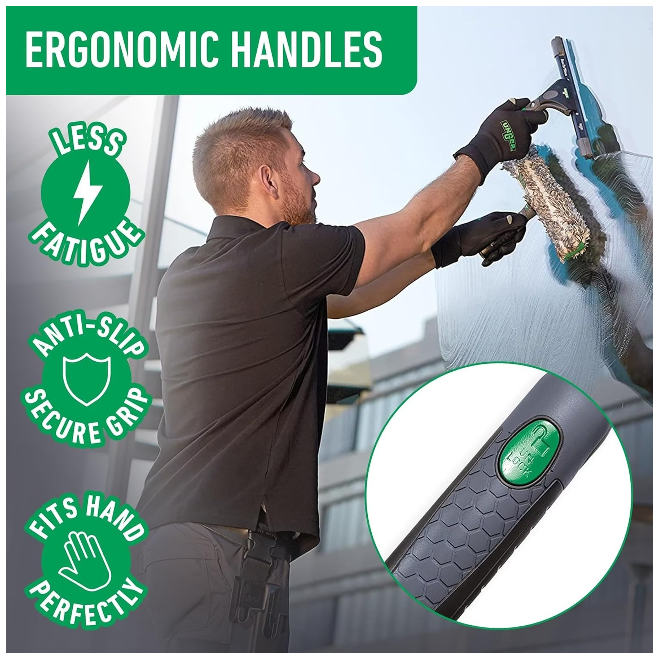 Ce produit a plusieurs variations. Les options peuvent être choisies sur la page du produitPoignée raclette Unger ErgoTec. Ergonomique, robuste et antidérapante. Compatible rails/caoutchoucs Unger et perches télescopiques. Idéale usage pro. Réf: 12483